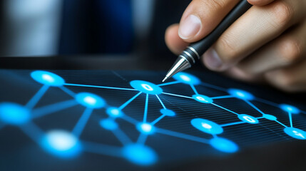 businessman’s hand holding a pen, gesturing to highlight key points during a discussion. Represents decision-making, leadership, focus, and professional analysis