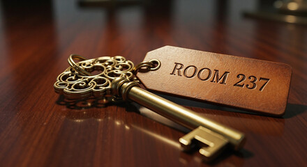 Vintage key with tag labeled Room 237 on wooden table