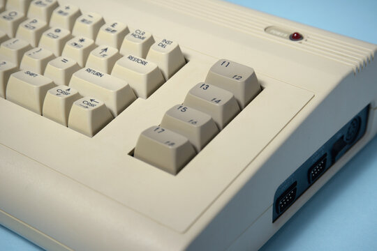 Retro computer from the 1980s close view of keys and ports