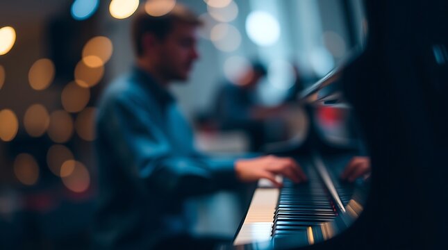 Piano keyboard with bright christmas lights on the background. Close-up shot of an old piano with decorated background