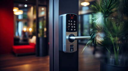 Closeup of a woman's finger entering password code on the smart phone and digital touch screen keypad entry door lock in front of a hotel room or apartment, Modern security, Smart device concept.