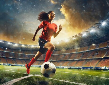 football or soccer player running fast and kicking a ball while training at dramatic stadium shot, dynamic active pose of skill development success