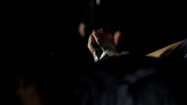 Female victim with tied hands trying to look at kidnapper, human trafficking