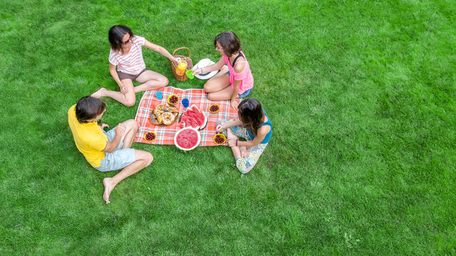 Happy family with children having picnic in park, parents with kids sitting on garden grass and eating healthy meals outdoors, aerial drone view from above, family vacation and weekend concept