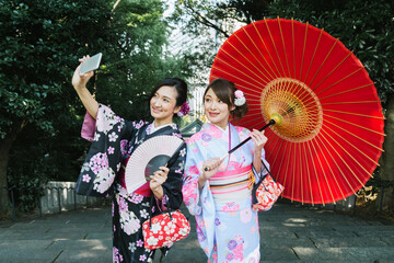 Japanese women with kimono walking in Tokyo