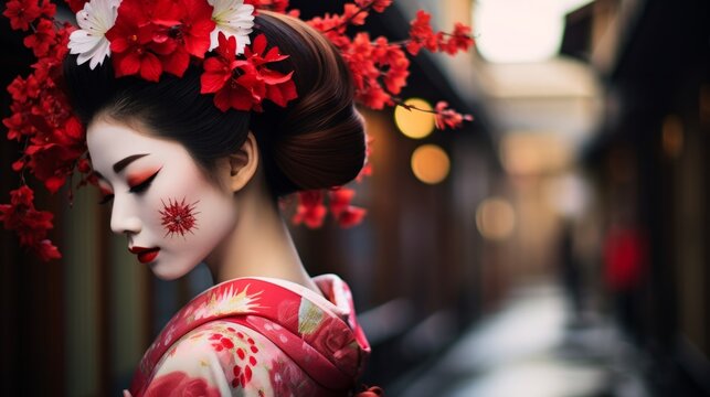 young pretty geisha in kimono with sakura and decoration
