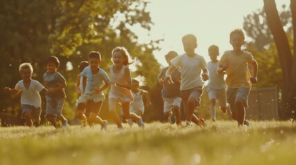 A group of happy children of boys and girls run in the Park on the grass on a Sunny summer day  The concept of ethnic friendship peace kindness childhood : Generative AI