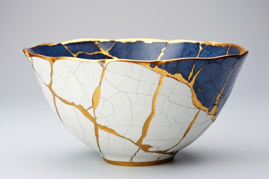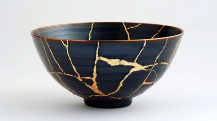 Elegant Japanese Kintsugi bowl with gold repairs. Showcasing the art of embracing imperfections and beauty in brokenness.