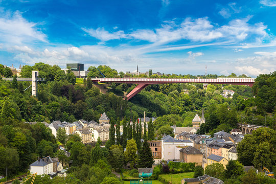 Horizontal Aerial panorama view of Luxembourg-City with the fortress wall, the Casemates, and Kirchberg skyline