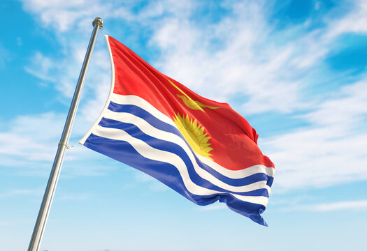 3d rendering Kiribati flag waving in the wind on flagpole. Perspective wiev Kiribati flag waving a blue cloudy sky