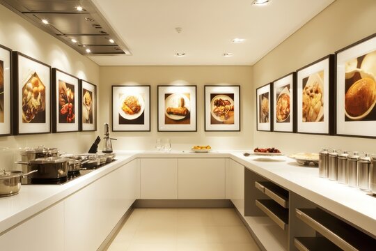 A kitchen with an art gallery theme, featuring framed culinary prints, sleek white surfaces, and spotlight lighting.