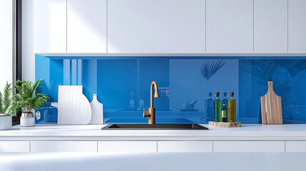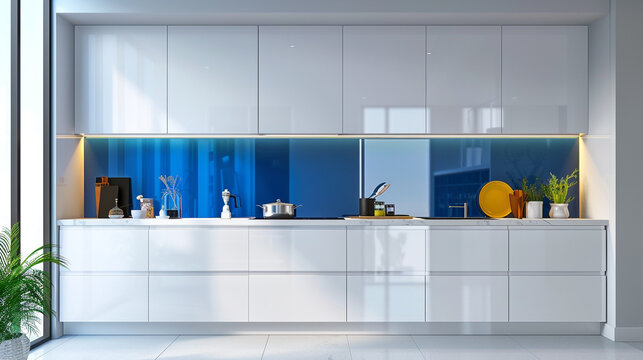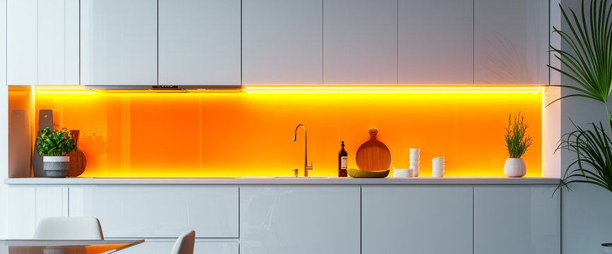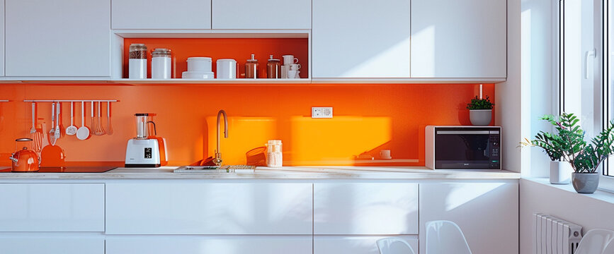 A minimalist kitchen with a vibrant, tangerine orange backsplash and crisp, white cabinets, surrounded by colorful accents and ample copy space.