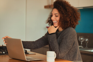 Diverse friends smiling while working on laptop at home