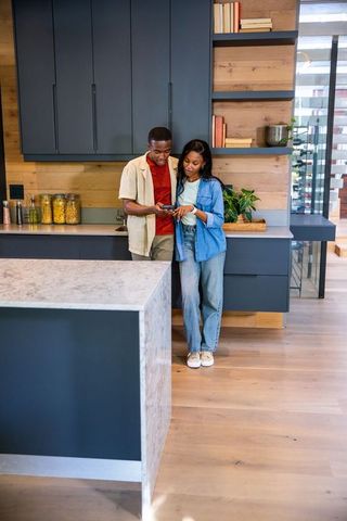 Couple checking smartphone in modern kitchen with minimalist decor