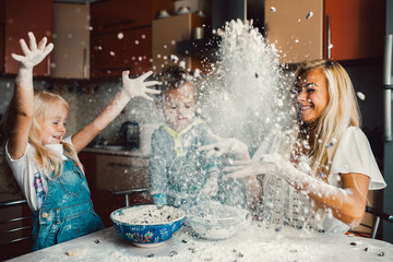 Smiling mom and toddler mixing batter in sunlit farmhouse kitchen, family baking moment