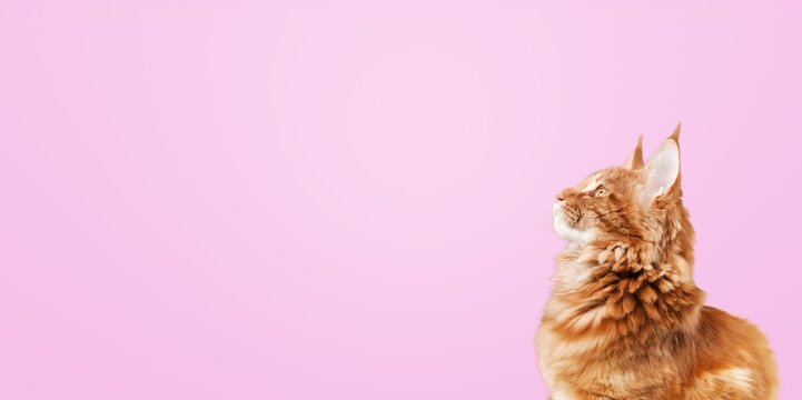 Close up profile portrait of cute ginger cat. Fluffy pet is staring in other side.