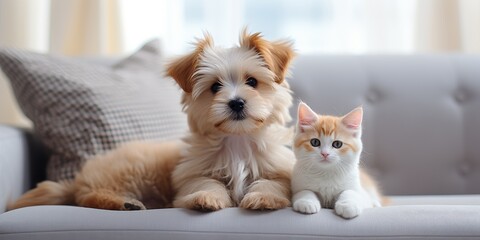 Cute kitten and puppy in the arms of a female veterinarian, in a veterinary clinic. Concept of advertising veterinary services and pet care.