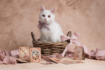 A Ragdoll kitten with blue eyes looking up in a studio setting.