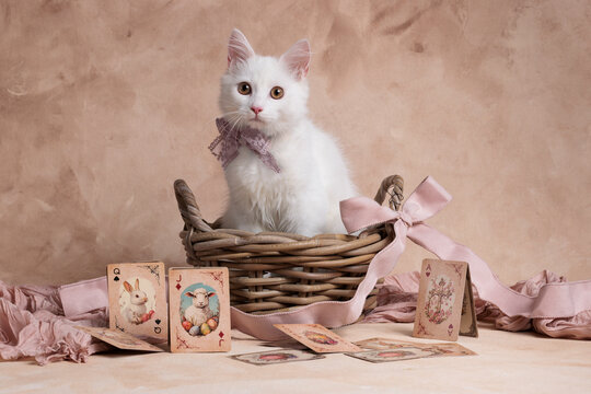 cute, funny little kitten in a knitted hat in a knitted plaid on a white background