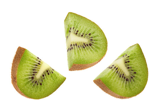 kiwi fruit with slices and green leaves isolated on a white background. top view
