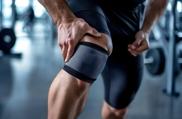Man puts knee brace to support painful leg. Athlete wears elastic kneecap bandage for compression, fix trauma. Close-up leg support sleeve for health problems, pain recovery in gym.