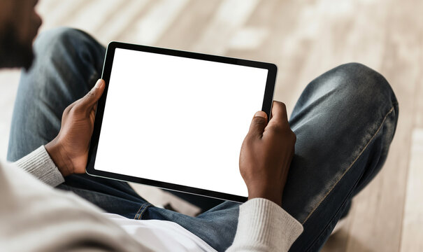 Blank screen, The tablet is positioned upright at eye level and has no background. It is positioned directly above their knee