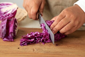 Close-up of sliced red cabbage with knife on wooden chopping board