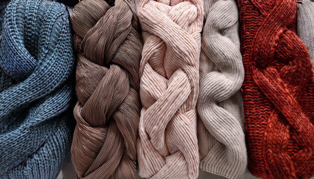 Cropped close up shot of seamless woolen knitting pattern of fall / winter season warm sweater, clearly visible fiber texture of stylish hipster knitwear clothing. Background, copy space, top view.