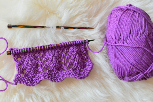 close up of hand knit fabric in lace stitch pattern in purple merino wool, hand knitting
