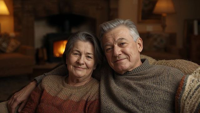 Cozy mature couple lying on plush rug wearing cable knit sweaters showing ring