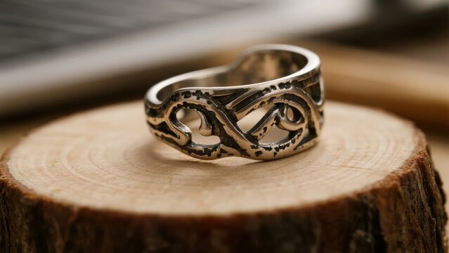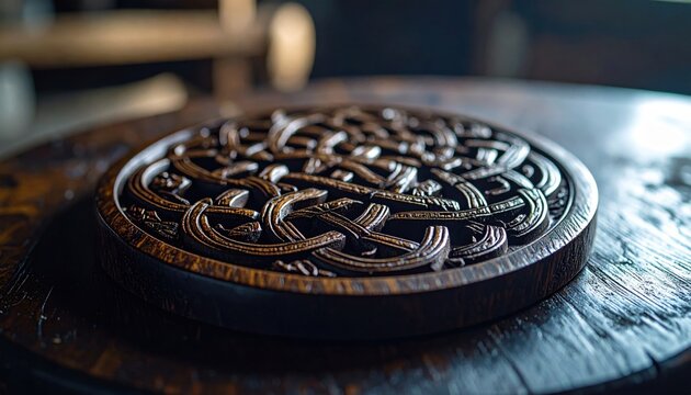 Intricate Celtic knotwork pattern etched into a dark, polished wood surface, a testament to ancient craftsmanship and heritage.