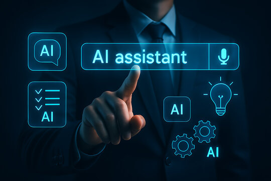 Professionals in a future workshop learn to collaborate with an AI, taking notes as the AI explains its complex code, a process known as augmented cognition for rapid upskilling.