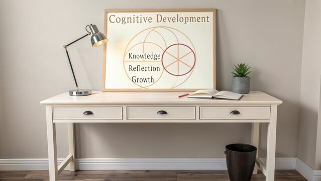 Modern Workspace with Cognitive Development Concept in Decorative Frame, Desk Lamp, Plant, Notebook, and Minimalist Design