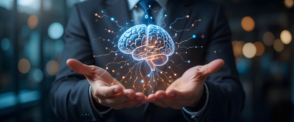 Digital brain interface activated by a man, highlighting the connection between human cognitive abilities and artificial intelligence in a hightech, futuristic environment