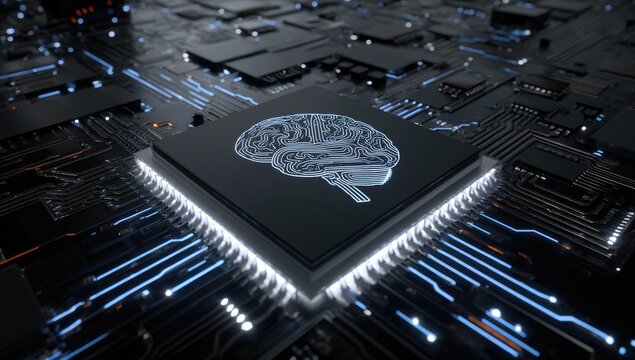 Glowing neon brain symbol integrated into a high-tech microchip circuit board emitting vibrant blue and orange lights illustrating artificial intelligence and cognitive computing