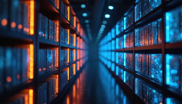 Rows of digital data storage units glow with blue, orange light in futuristic library. Futuristic digital library shelves with glowing data nodes. Information storage system concept. Future tech