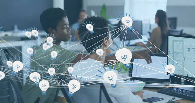 Image of network of bulb icons over two african american female colleagues discussing at office