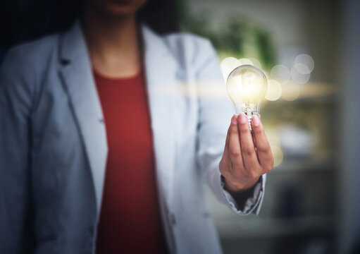 Light bulb, innovation and bright idea with vision, strategy and growth mindset for startup. Closeup hand of leading, thinking and motivated business woman holding lightbulb and showing knowledge