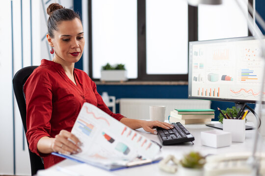 Business woman in start up company working on computer and analyzing charts on clipboard, sitting at desk. Successful concentrated manager working on deadline project typing.