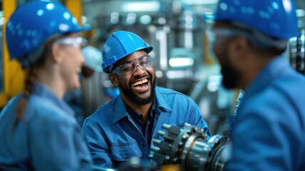 Two happy intelligent engineers discuss production details in factory