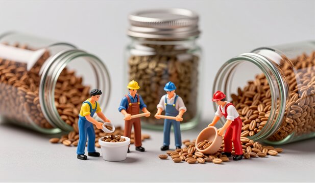 Miniature workers handle seeds in jars on a tidy surface during a bright crafting session