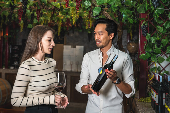 Wine seller man recommend good wine for young female customer in winery retail shop