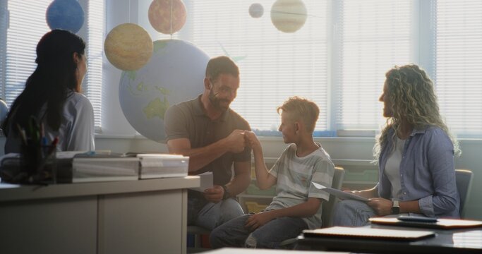 Mother and Father Looking at School Test Grades of Their Son During Parents Evening. Teacher and Parents Happy About Excellent Academic Performance and Behavior of Elementary School Boy. Medium Shot.
