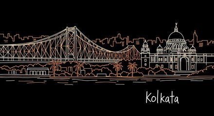 Beautiful view of Kolkata city with a Howrah bridge on the river Hooghly at twilight.