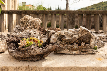 Authentic decorative pieces of wood with succulent plants outside in the garden in the rural area south of Dubrovnik, Konavle, Dalmatia Croatia. Natural raw textured material, eco feeling