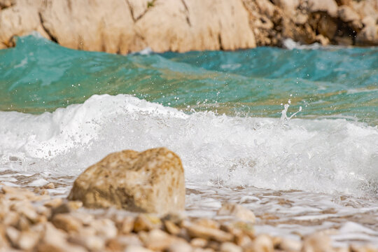Amazing view of waterfront in Nugal beach in Makarska Riviera, between towns of Makarska and Tucepi. Dalmatia region of Croatia. Beautiful waves on a sunny summer day. Copy space. Selective focus
