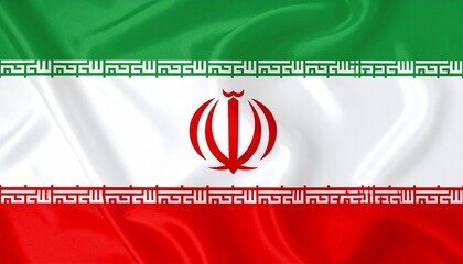 "Iran's national flag with horizontal green, white, and red stripes, featuring a central emblem of 'Allah' and tulip motif, with Kufic script repeating 'Allahu Akbar' 22 times to mark the Islamic Revo