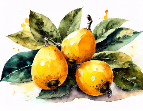 Bright orange kumquats with green leaves, painted in a watercolor style