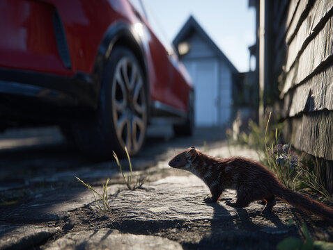 Kuna przemykająca po brukowanym podjeździe, blisko drewnianego budynku. W tle, na pierwszym planie, rozmyte, czerwone tylne koło samochodu.