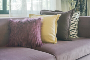 L shape purple sofa with stylish pillows in living room